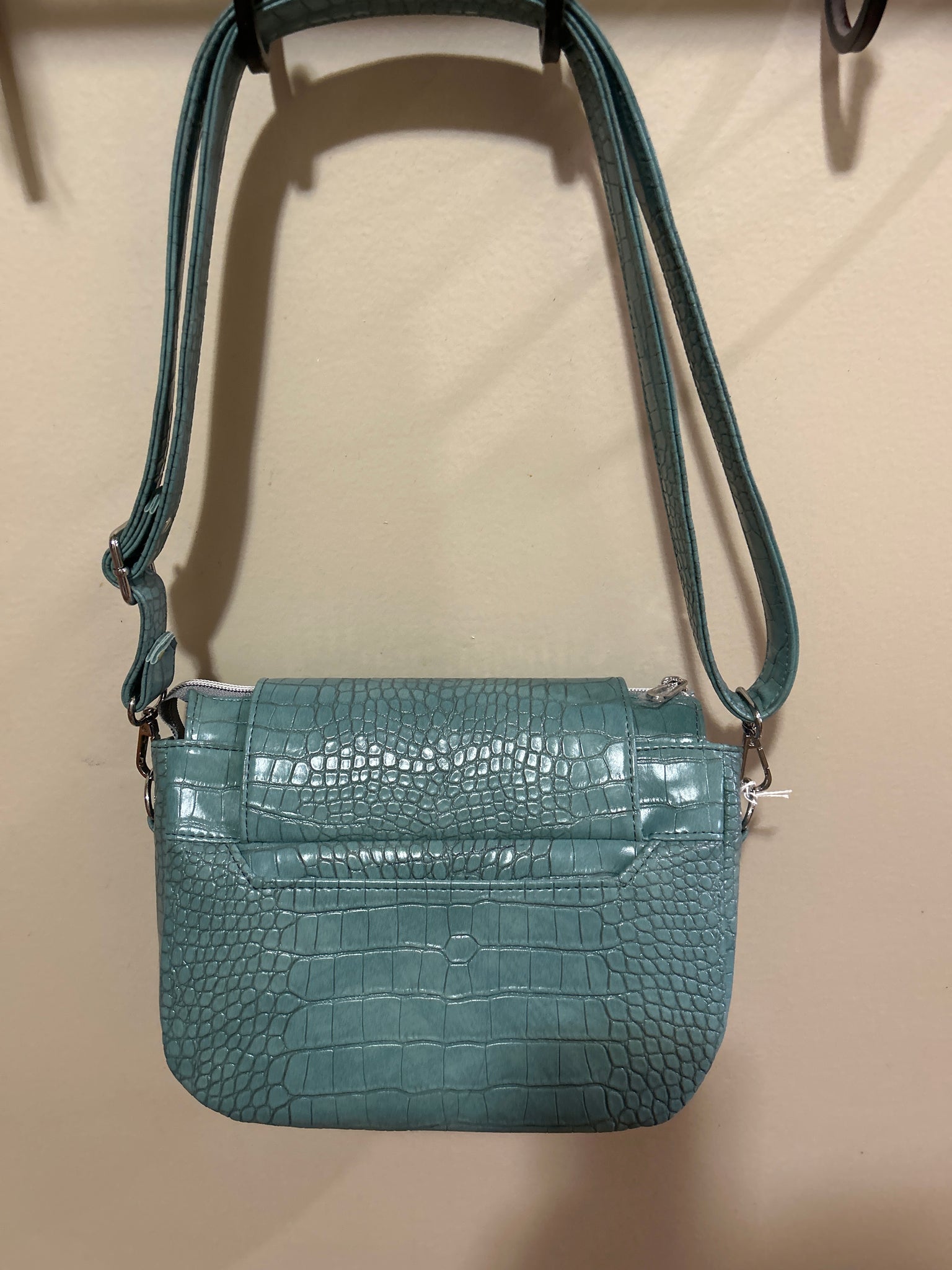 • This soft Turquoise colored croc pattern vinyl crossbody has silver toned hardware with top zipper closure and a turn lock flap