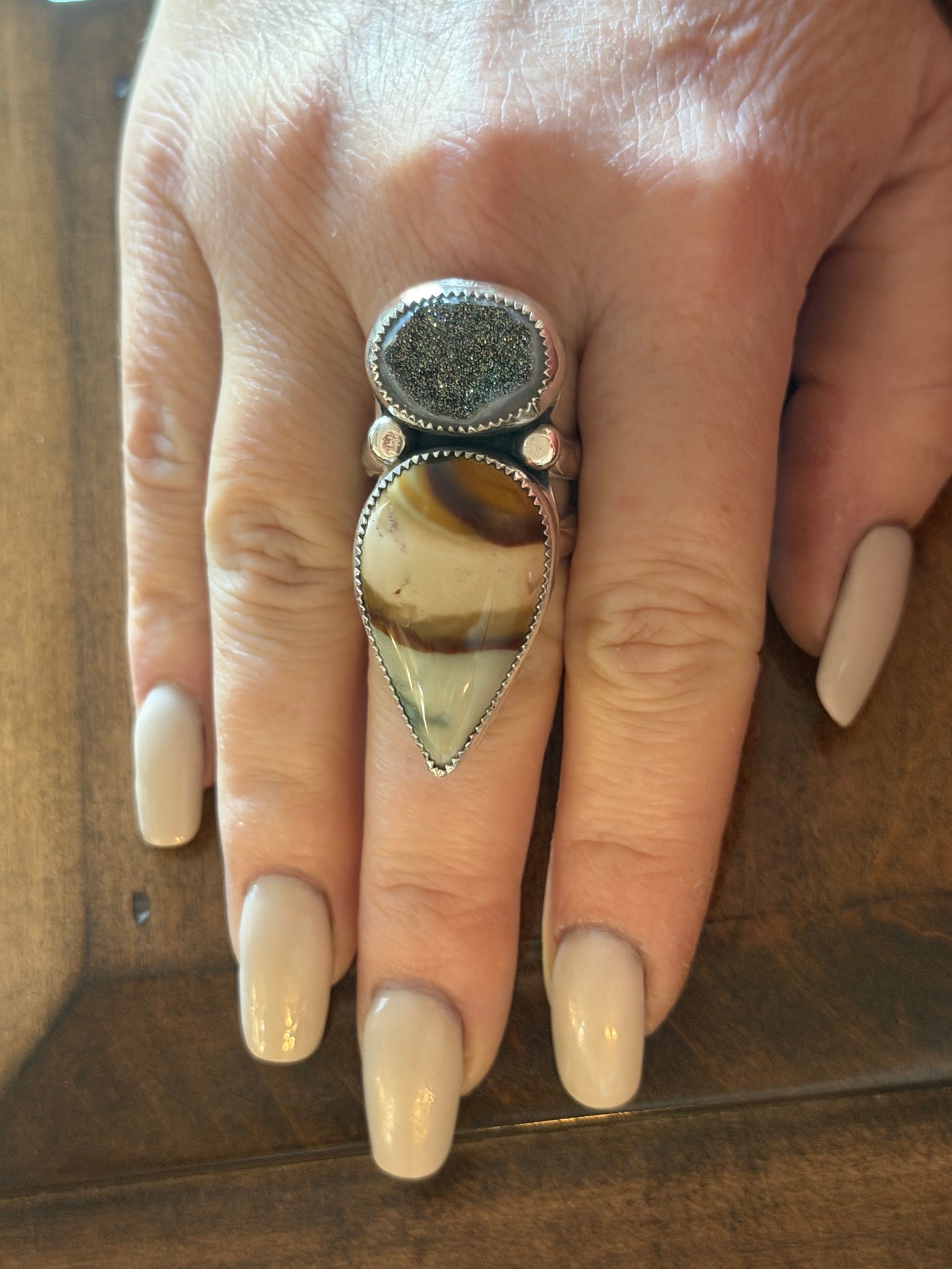 This beautiful one-of-a-kind ring really sparkles with the blue gray Agate Druzy along side this amazing Jasper with shades of cream, rust, blue & mustard